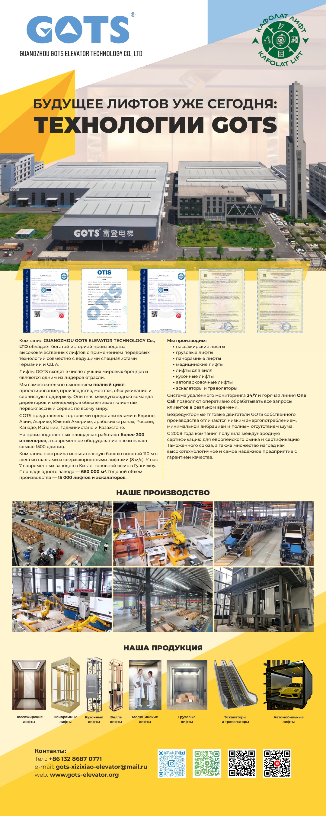 Компания GOTS Elevator была основана в 2008 году и с тех пор стала одним из ведущих производителей лифтов и эскалаторов на мировом рынке. За годы работы мы накопили обширный опыт в проектировании, производстве, монтаже и обслуживании лифтов, а также в внедрении современных решений для различных типов зданий.